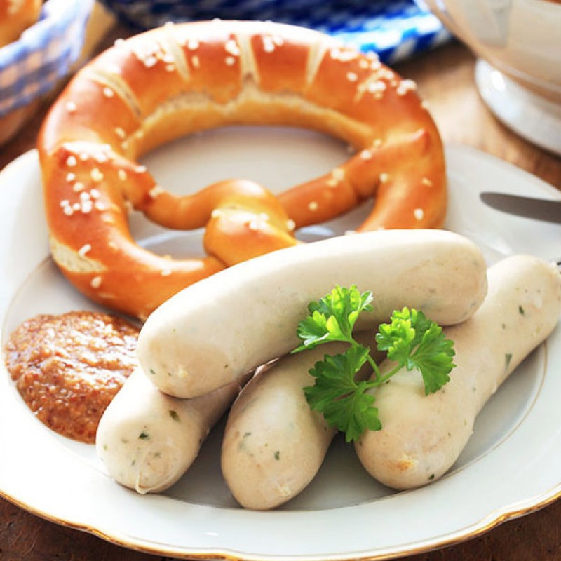 Мюнхенские (Weißwurst) — это традиционные белые колбасы из телятины и свинины, которые не жарят, а отваривают в горячей воде. Они имеют светлый цвет, нежную консистенцию и деликатный вкус с нотами петрушки, муската и лимона. Подаются с пшеничной булочкой и сладкой баварской горчицей — классика утреннего завтрака в Баварии.